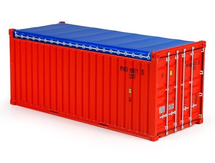 Контейнер, сходный во всех отношениях с контейнером общего назначения, за исключением того, что у него нет жесткой крыши, но может быть гибкий раздвижной или съемный чехол, сделанный например, из брезента или пластика, или армированного пластического материала и обычно поддерживаемый откидными или съемными балками крыши. Такие контейнеры могут иметь откидные или съемные верхние торцевые поперечные элементы над своими торцевыми дверями.