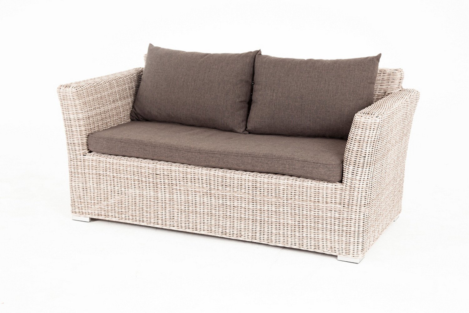 Размеры (ШхВхГ) двухместного дивана Капучино - 170х81,5х86,5 см. Все поверхности дивана выполнены переплетением искусственного ротанга бежевого цвета, милого и спокойного цвета, который подойдет для любой обстановки.