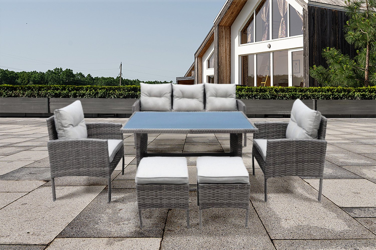 Для большой семьи или компании друзей потребуется большое пространство для сидения, особенно на природе, где каждый хочет сидеть выше уровня земли, чтобы не контактировать с насекомыми и грязью. Обеспечить комфортное пребывание на улице позволит набор садовой мебели Farrell, который включает в себя диван, достаточной высокий стол, два кресла и два пуфа (тумбы).