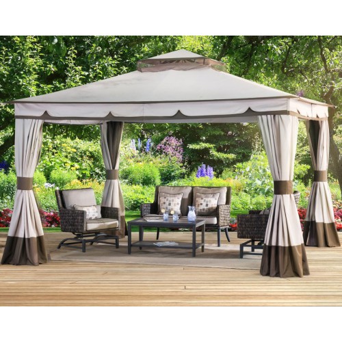 Твином называют очень современный дизайн крыши, который отлично пропускает через себя воздух, есть специальные отверстия, предназначенные для слива воды в тот момент, когда идёт дождь. Каркас беседки изготавливается из кованого металла, имеющего угловую форму. Благодаря этому конструкция становится максимально прочной и оригинальной. В комплекте находится четыре москитных сетки, которые прикрепляются при помощи липучек к каркасу, на них есть молния. У самой беседки квадратная форма, она отлично подойдёт для летнего кафе или для загородного дома, а также празднования разнообразных мероприятий. Она может хорошо защитить от дождя и солнца.