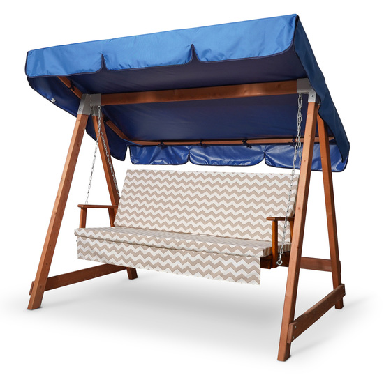 Это цветной матрас, предназначенный для садовых качелей, на него нанесён принт зигзага. Изготовлен данный матрас из европейской ткани с тефлоновым покрытием, в качестве наполнителя используется холлофайбер. Длина изделия составляет 155 см, толщина 5 см, глубина сидения 49 см, а высота спинки 55 см.