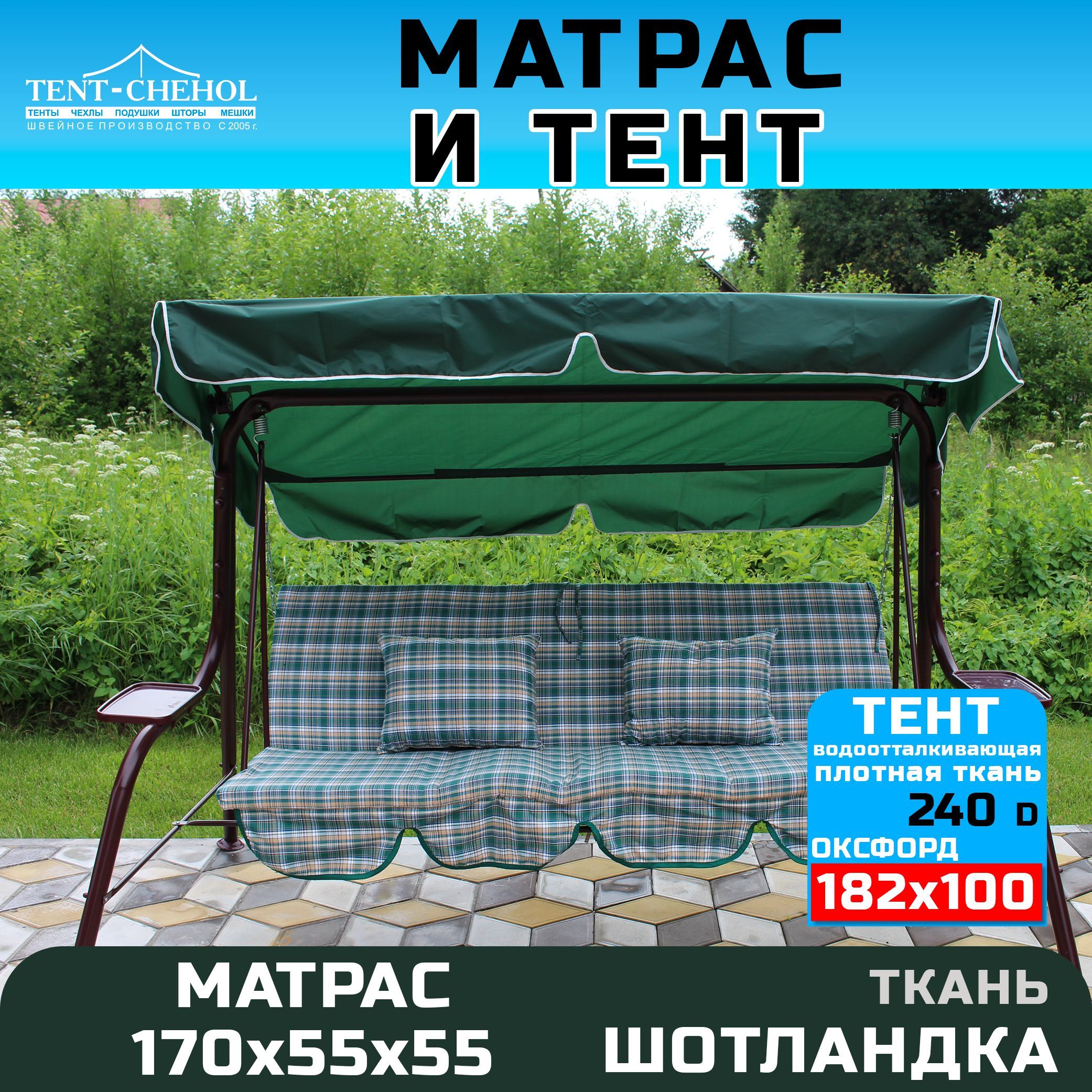 Тент и матрас для садовых качелей, 182х100 и 170х55х55 еловый, зелёная шотландка